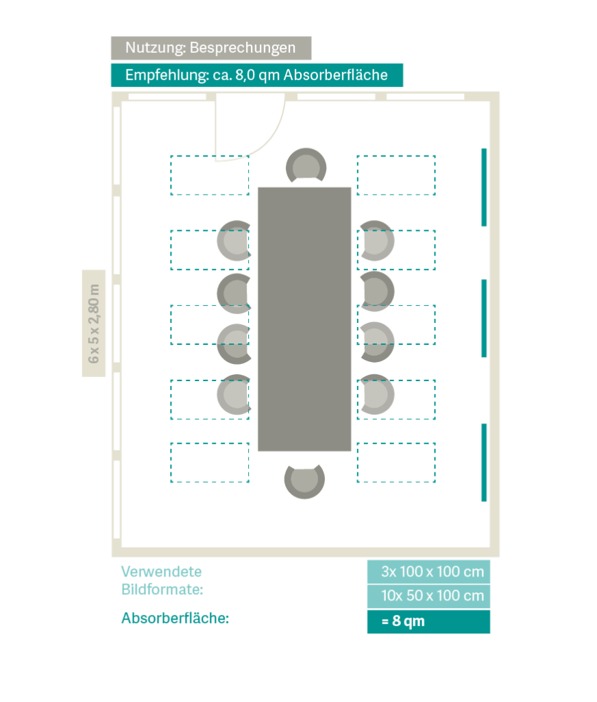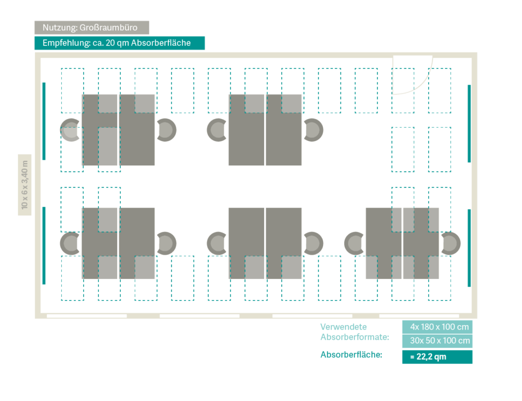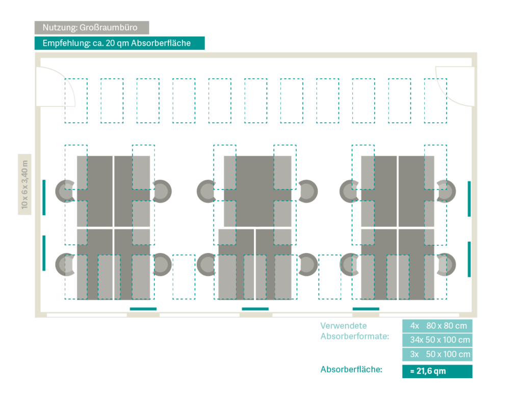 Die Illustrationen zeigen Möglichkeiten, um die Raumakustik in Büros zu verbessern. Visualisiert werden verschiedene Bürotypen vom Chefbüro, Großraumbüro, Einzelbüro oder auch der Flur. Die gestrichelten Elemente sind von der Decke abzuhängen oder dort anzukleben. Blau gezeichnete Elemente sind Akustikelemente, die an der Wand aufgehangen oder angeklebt werden.
