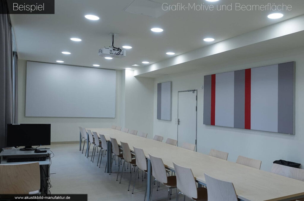 Besonders schwierig ist häufig die Ausrüstung von Besprechungsräumen mit schallabsorbierenden Elementen. Häufig wird der Platz an den Wänden benötigt für Beamerprojektion, Whiteboard oder Flipchart. Aber auch fast vollständig mit Glaswänden umgebene Räume stellen das Office-Management in puncto Raumakustik vor eine Herausforderung. Eine mögliche Lösung sind Absorberplatten ohne Bezug als kostengünstige und praktische Variante der Schallabsorption. Sie können geklebt oder gehängt werden. Bei Räumen mit viel Glas können diese Schallabsorber auch direkt auf dem Glas befestigt werden. Bei einem sehr hohen Anspruch an Repräsentation sind Akustikbilder mit Stoffbezug (einfarbig oder mit Motiven) mit entsprechend variierter Aufhängung das Produkt der Wahl. Vor den Glaswänden aufgehängte Akustikbilder oder dort verklebte Absorberplatten sind gleichzeitig ein angenehmer Sichtschutz im “Aquarium” wie gläserne Besprechungsräume oftmals genannt werden.