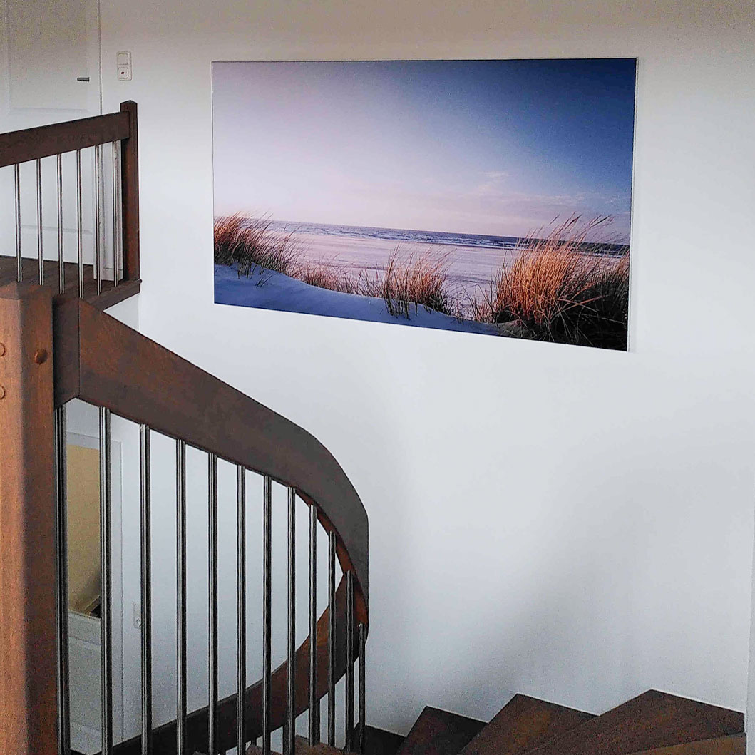 Größe & Position: Ein großes Querformat über dem Tisch (z. B. 150 × 100 cm) oder zwei kleinere Bilder (z. B. 80 × 80 cm links/rechts) sind ideal. Mindestens 1,5 m² Fläche bei offenem Grundriss.