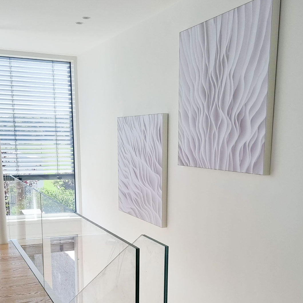 Größe & Position: Je nach Raum mindestens 2 m² Absorberfläche – zum Beispiel zwei Bilder à 120 × 80 cm an nebeneinanderliegenden Wänden. In langen Fluren sind wiederkehrende, kleinere Formate (z. B. 60 × 80 cm) ideal.