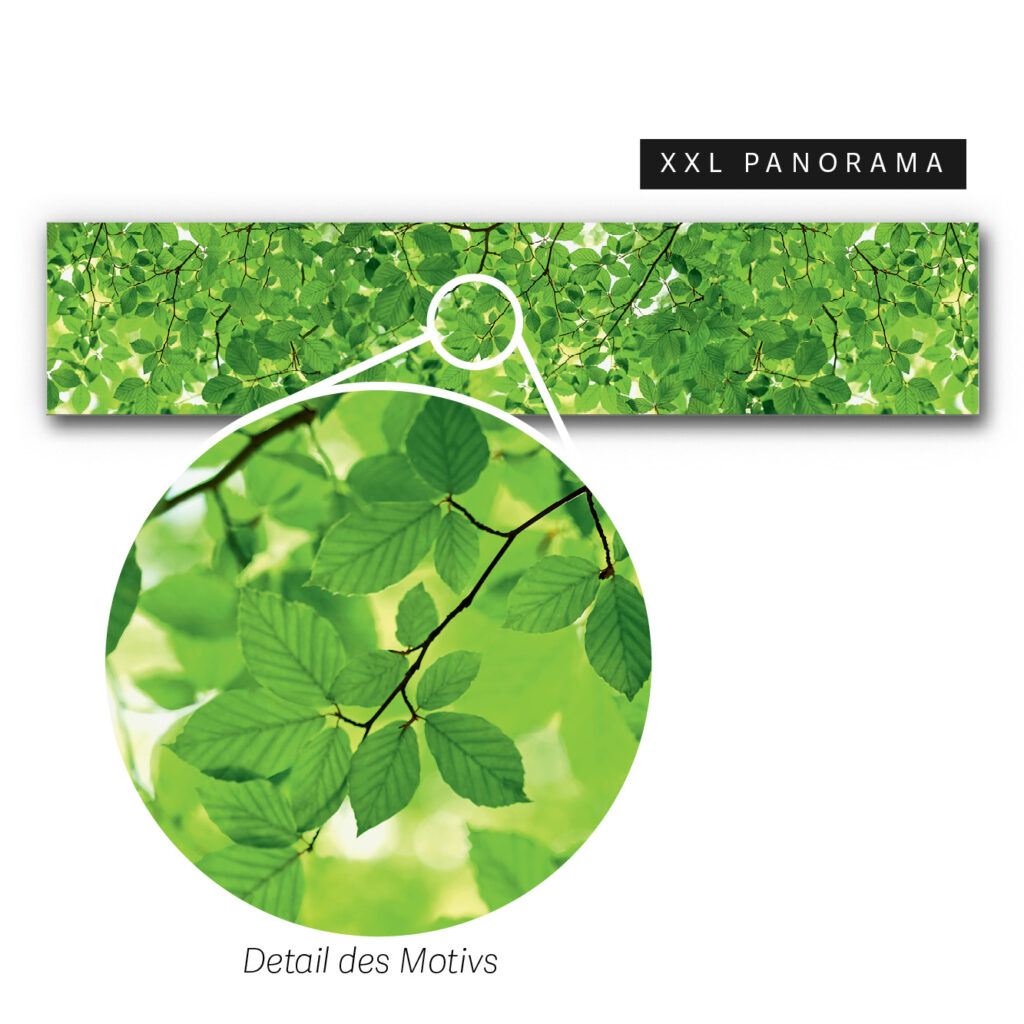 Akustikbild Waldgeflüster mit weißem Rahmen (580 cm x 120 cm x 5 cm) – Detailansicht