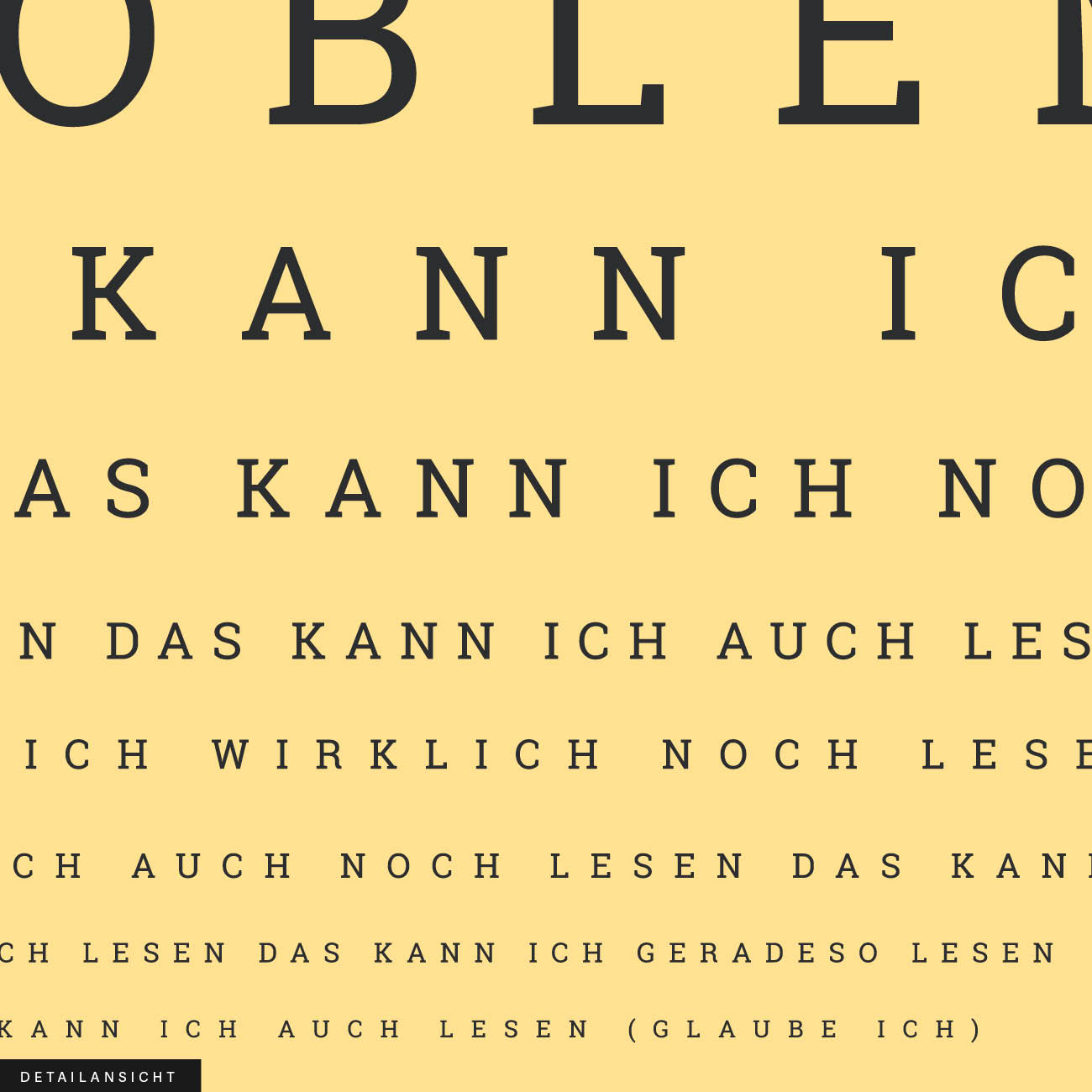 Sie sind hier: Akustikbilder mit Motiven » Akustikbild Spruch: Sehtest “Kein Problem” (Farbe individualisierbar)