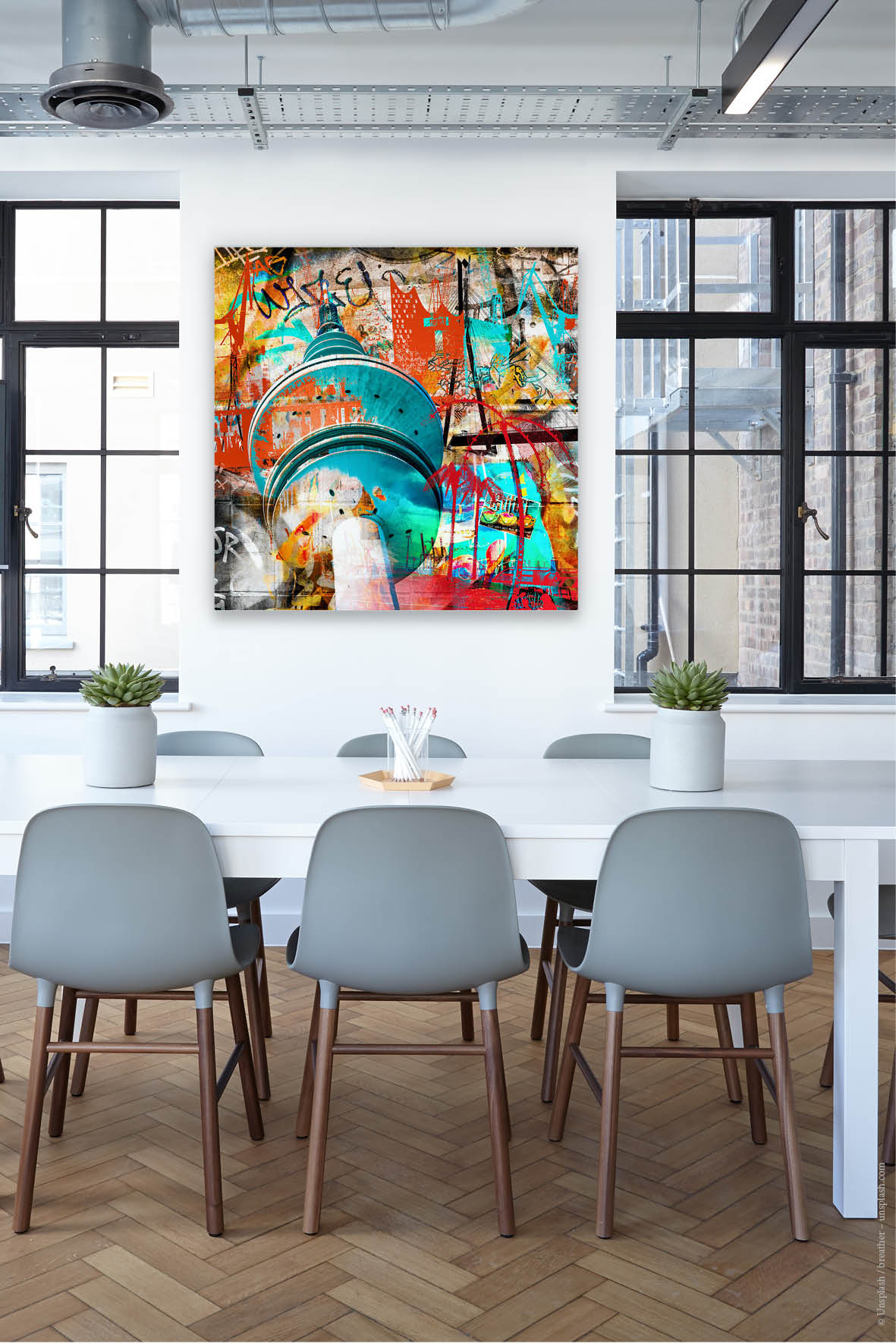 | größere Räume oder mehr Personen | Kombinieren Sie mehrere Akustikbilder für mehrere Wände oder fragen Sie ein größeres Bild an. Wir fertigen bis 700 cm x 400 cm |
