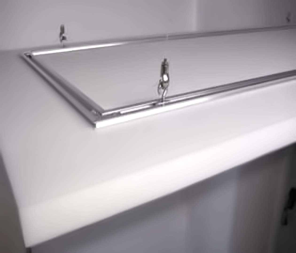 Basotect® ist ein Weichschaum. Je nach Licht-Situation ist es möglich, dass Poren sichtbar sind. Durch den rückseitigen Montage-Rahmen ist für den Betrachter “von unten” kein Rahmen sichtbar – das Deckensegel wirkt klar, leicht und zurückhaltend im Design. Es ist hochweiß. Diese schlichte Optik macht es besonders geeignet für moderne, minimalistische Räume, in denen Funktion und Gestaltung im Einklang stehen sollen. Wir empfehlen die Ausführung mit gefaster Kante.