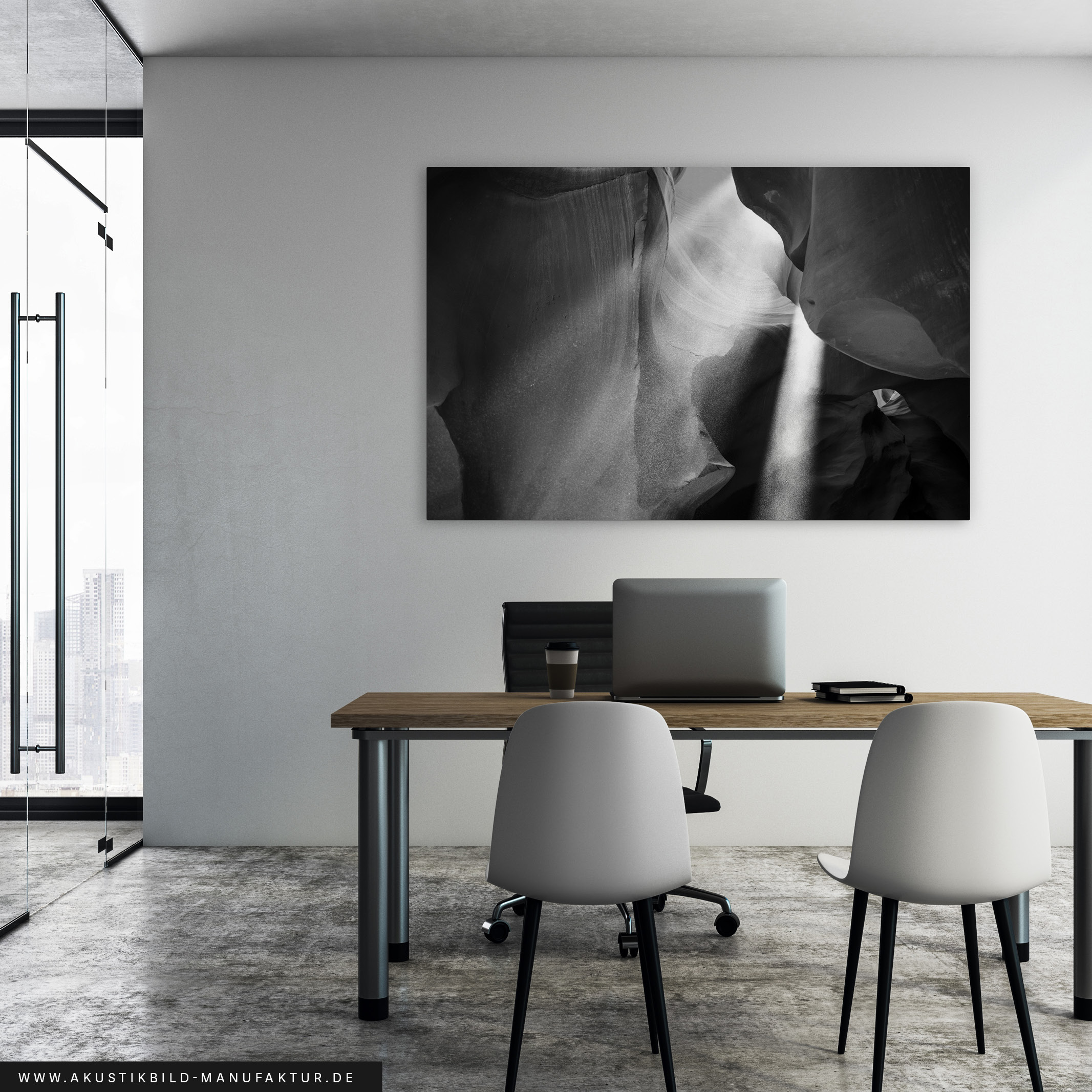 Am besten platzieren Sie das Akustikbild gegenüber oder hinter der Schallquelle. Typische Orte sind gegenüber oder hinter einem Schreib- oder Esstisch. Noch besser wirken mehrere Elemente an verschiedenen Wänden. Je besser die Platzierung, desto größer der Effekt – besonders, wenn nur ein Bild geplant ist.