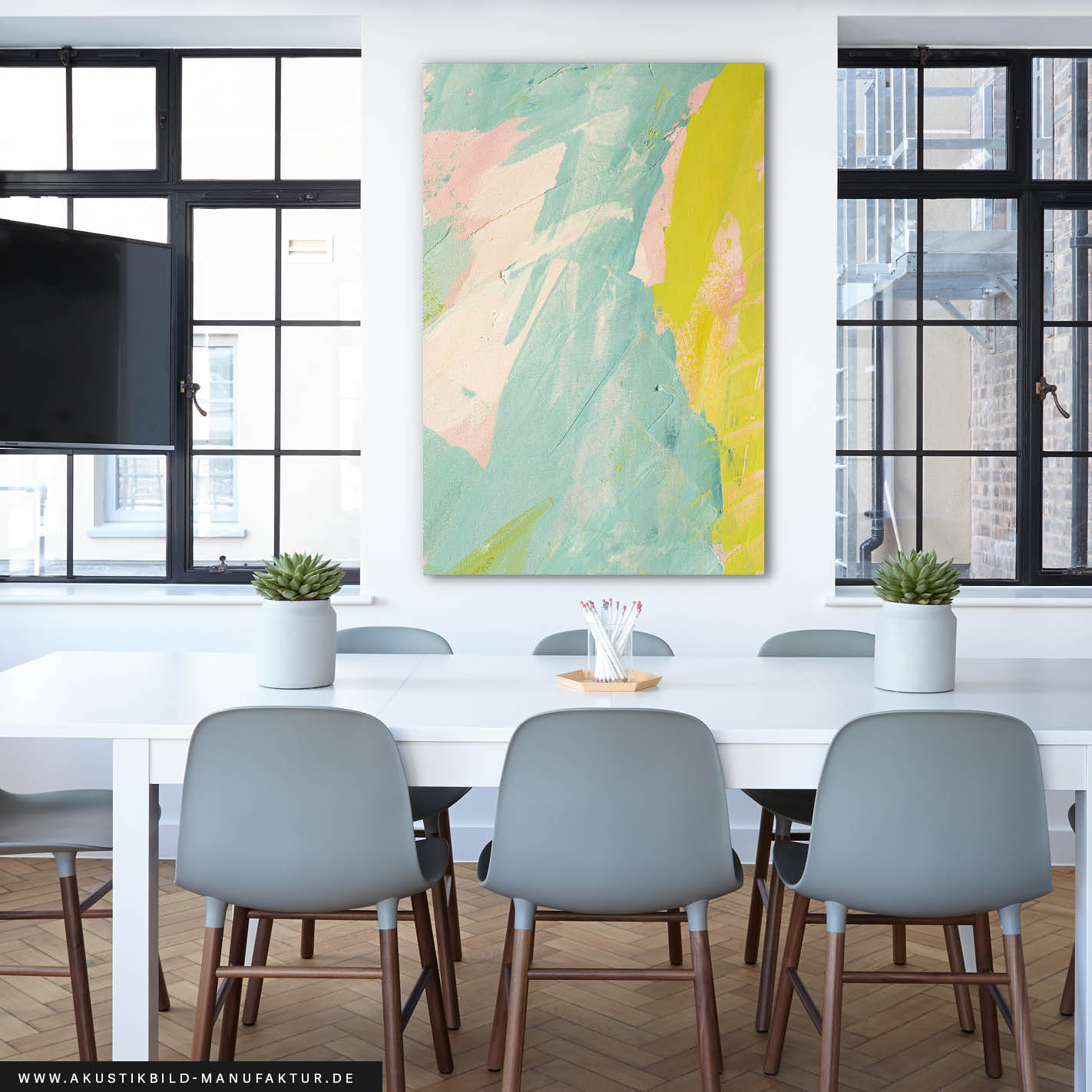 Am besten platzieren Sie das Akustikbild gegenüber oder hinter der Schallquelle. Typische Orte sind gegenüber oder hinter einem Schreib- oder Esstisch. Noch besser wirken mehrere Elemente an verschiedenen Wänden. Je besser die Platzierung, desto größer der Effekt – besonders, wenn nur ein Bild geplant ist.